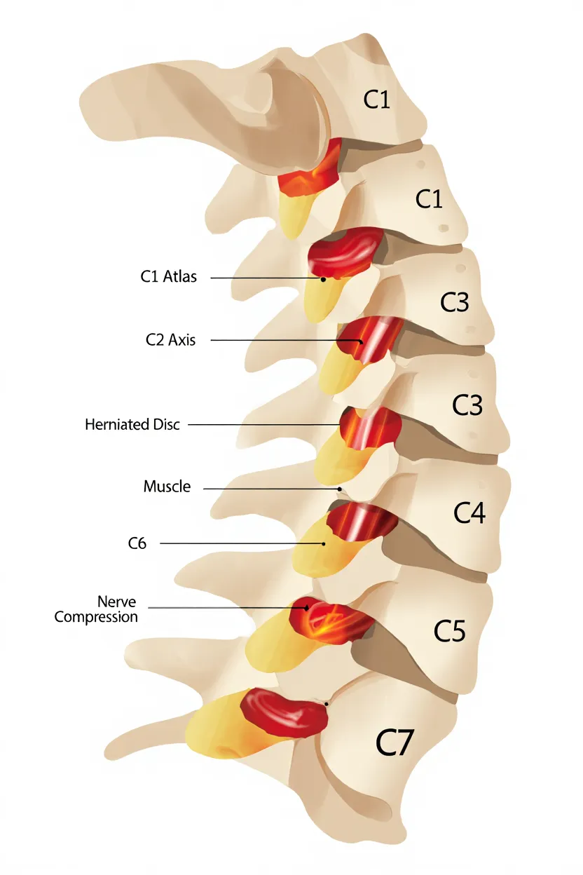The cervical spine, made up of seven vertebrae at the top of the spinal column, supports the head and protects the spinal cord. Pain in this region may arise from muscles, ligaments, nerves, discs, or joints. Neck pain can be acute (lasting days to weeks) or chronic (lasting months or longer).