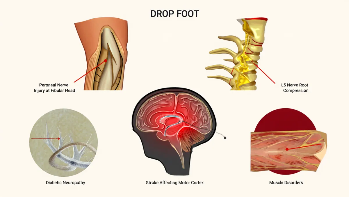 Drop foot is not a disease but a neurological or muscular symptom. It occurs when the nerves or muscles that control the ankle and toes are weakened or paralyzed. In spine-related cases, drop foot often results from lumbar nerve root compression affecting the peroneal nerve pathway.