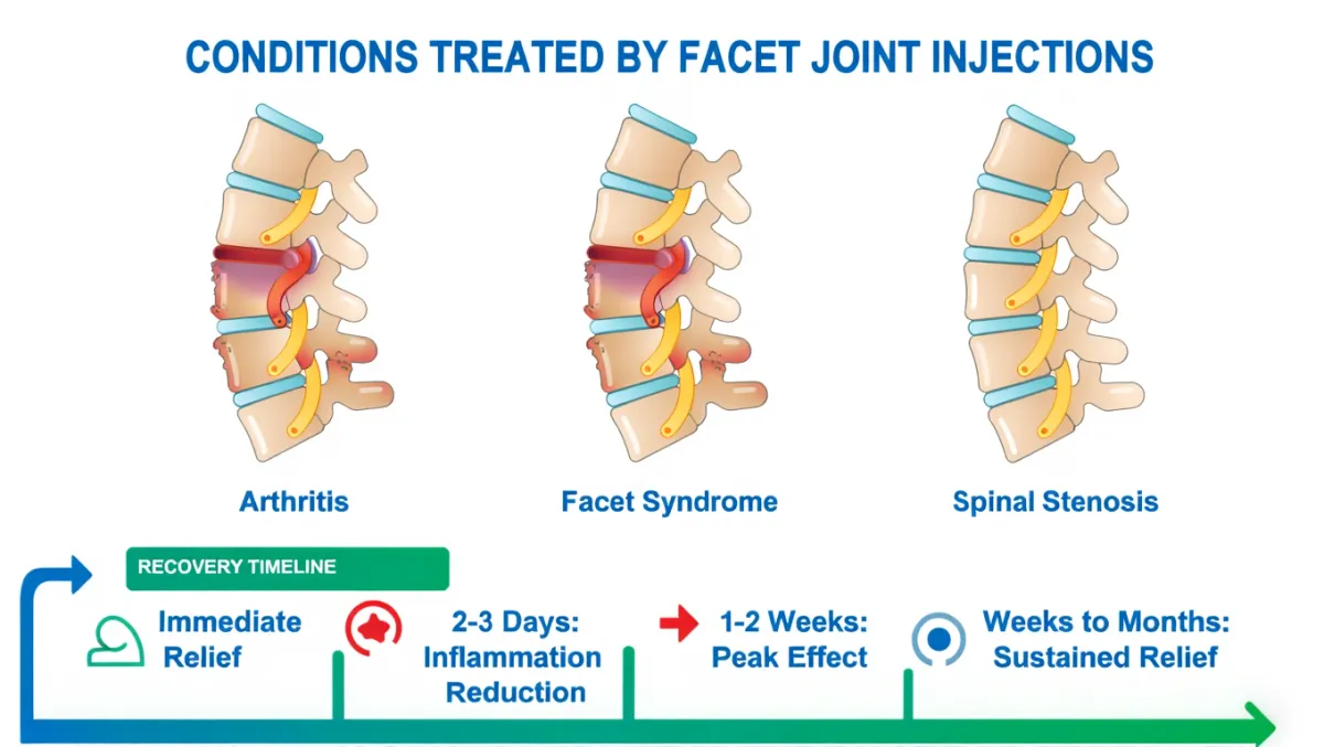 Facet pain often worsens with bending backward, twisting, or prolonged standing. Injections help confirm the diagnosis.