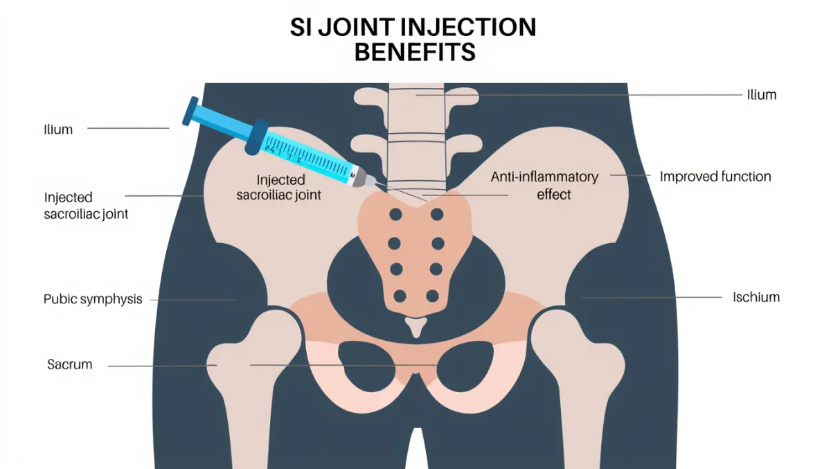 Scientifically: SI joint injections involve percutaneous placement of a spinal needle into the intra-articular space under fluoroscopy or CT guidance, followed by injection of corticosteroid and anesthetic to reduce nociceptive signaling and confirm pain origin.