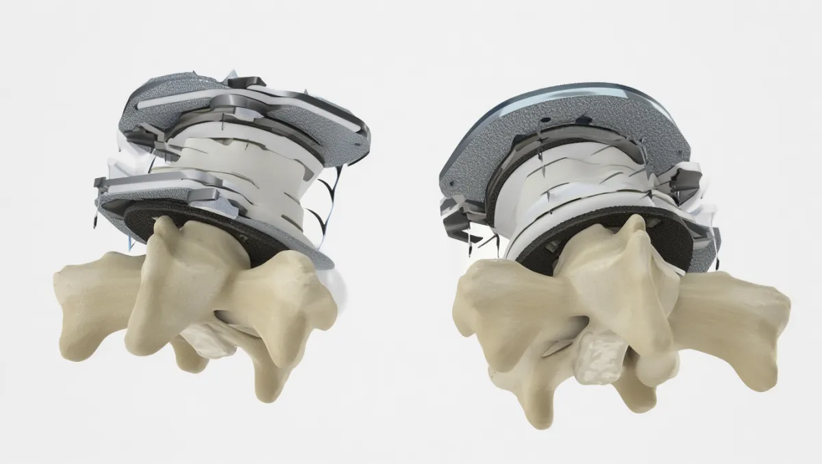 Artificial disc placement: The implant is placed between vertebrae to preserve motion.